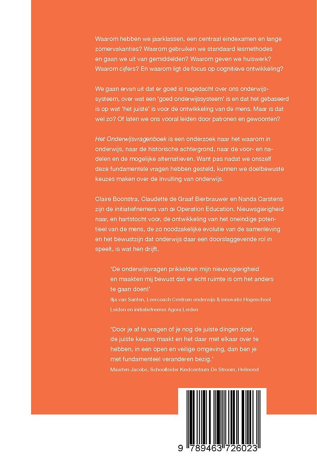 'Het Onderwijsvragenboek' is een onderzoek naar het waarom in onderwijs, naar de historische achtergrond, naar de voor- en nadelen en de mogelijke alternatieven. Want pas nadat we onszelf deze fundamentele vragen hebben gesteld, kunnen we doelbewuste keuzes maken over de invulling van onderwijs.
