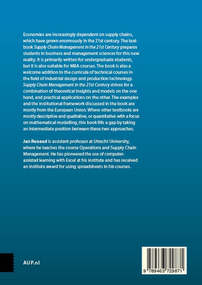 Economies are increasingly dependent on supply chains, which have grown enormously in the 21st century. The textbook 'Supply Chain Management in the 21st Century' prepares students in business and management sciences for this new reality. It is primarily written for undergraduate students, but is also suitable for MBA courses. The book is also a welcome addition to the curricula of technical courses in the field of industrial design and production technology.