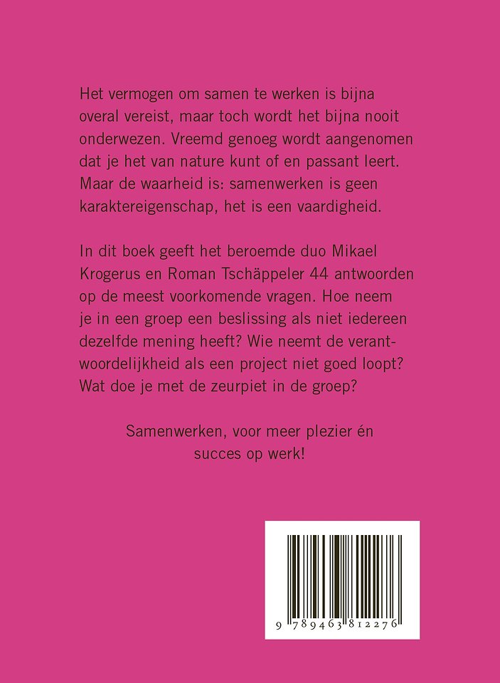 In dit boek geeft het beroemde duo Mikael Krogerus en Roman Tschäppeler 44 antwoorden op de meest voorkomende vragen. Hoe neem je in een groep een beslissing als niet iedereen dezelfde mening heeft? Wie neemt de verantwoordelijkheid als een project niet goed loopt? Wat doe je met de zeurpiet in de groep?