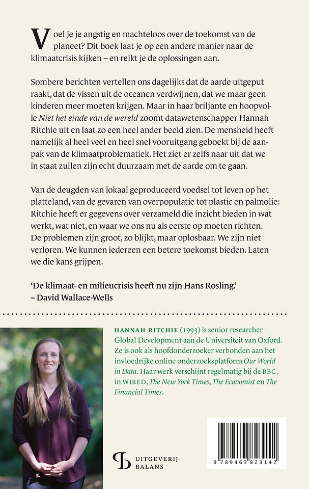 Hannah Ritchie (1993) is senior researcher Global Development aan de Universiteit van Oxford. Ze is ook als hoofdonderzoeker verbonden aan het invloedrijke online Our World in Data. Haar werk verschijnt regelmatig bij de BBC, in WIRED, The New York Times, de Economist en de Financial Times.