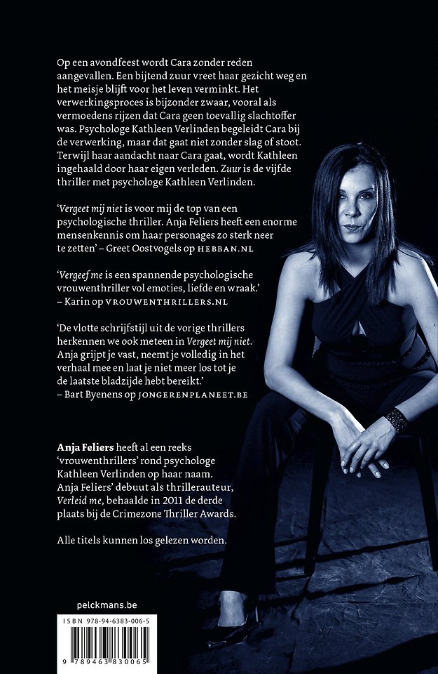 Het vijfde topboek in de Kathleen Verlinden-reeks Een bijtend scherpe whodunit. Op een avondfeest wordt Cara zonder reden aangevallen. Een bijtend zuur vreet haar gezicht weg en het meisje blijft voor het leven verminkt. Het verwerkingsproces is bijzonder zwaar, vooral als vermoedens rijzen dat Cara geen toevallig slachtoffer was. Psychologe Kathleen Verlinden begeleidt Cara bij de verwerking, maar het lijkt wel alsof ze door iets of iemand wordt tegengewerkt... Terwijl haar aandacht naar Cara gaat, wordt Kathleen ingehaald door haar eigen verleden. Zuur is de vijfde thriller met psychologe Kathleen Verlinden.