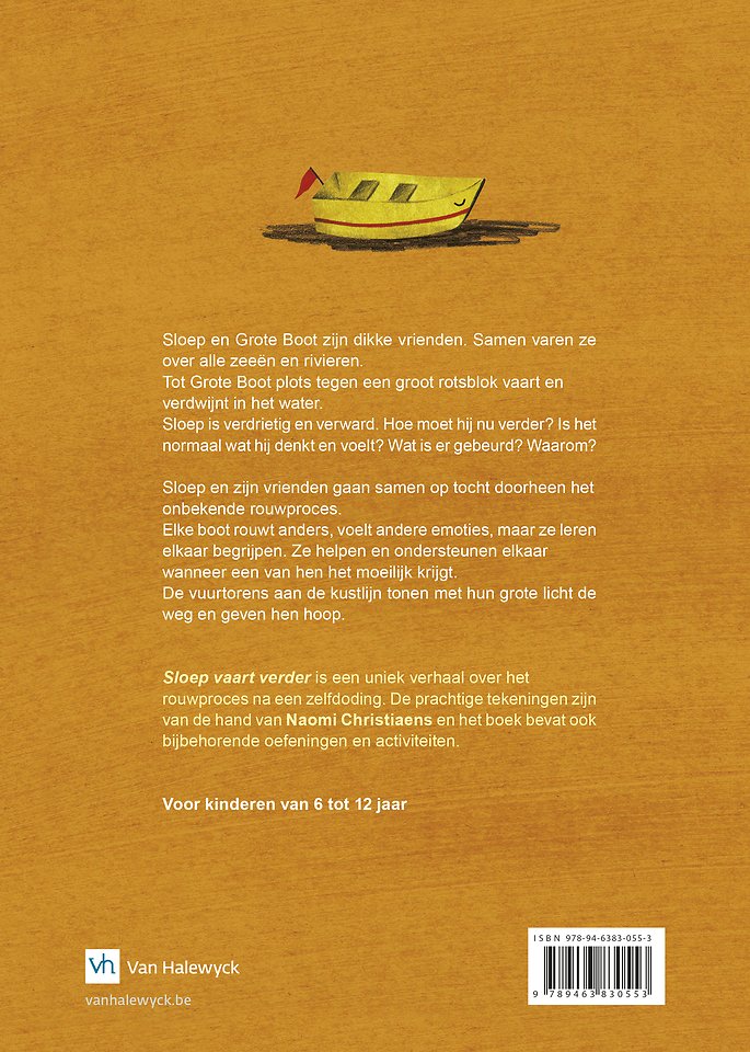 Sloep vaart verder is een uniek verhaal over het rouwproces na een zelfdoding. De prachtige tekeningen zijn van de hand van Naomi Christiaens en het boek bevat ook bijbehorende oefeningen en activiteiten.