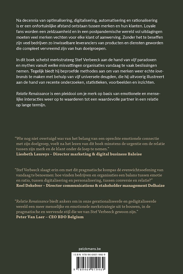 Meer over Stef VerbeeckNa decennia van optimalisering, digitalisering, automatisering en rationalisering is er een onfortuinlijke afstand ontstaan tussen merken en hun klanten. Loyale fans worden een zeldzaamheid en in een postpandemische wereld vol uitdagingen moeten veel merken vechten voor elke klant of aanwerving. Zonder het te beseffen zijn veel bedrijven zo inwisselbare leveranciers van producten en diensten geworden die compleet vervreemd zijn van hun doelgroepen.