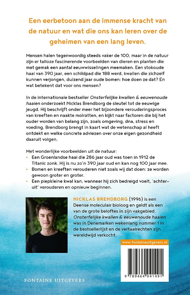 Microbioloog Nicklas Brendborg onderzoekt in de internationale bestseller Stokoude haaien & leeftijdloze kwallen wat de natuur ons kan leren over ouder worden. Hij beschrijft niet alleen het opvallende verouderingsproces van dieren als kreeften en naakte molratten, maar gaat ook in op de factoren die van belang zijn voor de mens, zoals omgeving, dna, stress en voeding. Brendborg brengt in kaart wat de wetenschap al heeft ontdekt en welke concrete adviezen daaruit volgen voor een langer en gezond leven.