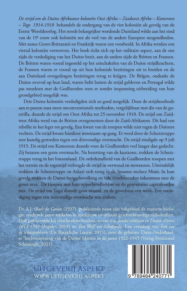 De strijd om de Duitse Afrikaanse koloniën Oost Afrika – Zuidwest Afrika – Kameroen – Togo 1914-1918 behandelt de ondergang van de vier koloniën als gevolg van de Eerste Wereldoorlog. Het steeds belangrijker wordende Duitsland wilde aan het eind van de 19e eeuw ook koloniën net als veel van de andere Europese mogendheden. Met name Groot-Brittannië en Frankrijk waren een voorbeeld. In Afrika werden een viertal koloniën verworven. Het boek richt zich op het militaire aspect, aan de ene zijde de verdediging van het Duitse bezit, aan de andere zijde de Britten en Fransen. De Britten waren vooral ingesteld op het uitschakelen van de Duitse strijdkrachten, de Fransen waren er vooral op uit hun koloniale bezittingen uit te breiden en de aan Duitsland overgedragen bezittingen terug te krijgen.
