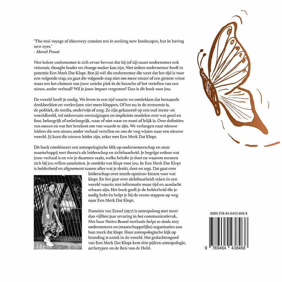 Niet iedere ondernemer is zich ervan bewust dat hij (of zij) naast ondernemer ook visionair, thought leader en change maker kan zijn. Niet iedere ondernemer heeft in potentie Een Merk Dat Klopt. Ben jij wél die ondernemer die weet dat het tijd is voor een volgende stap, en gaat die volgende stap niet om meer omzet of een grotere winst maar om het claimen van jouw unieke plek in de branche of het vertellen van een nieuw, ander verhaal? Wil je jouw impact vergroten? Dan is dit boek voor jou.