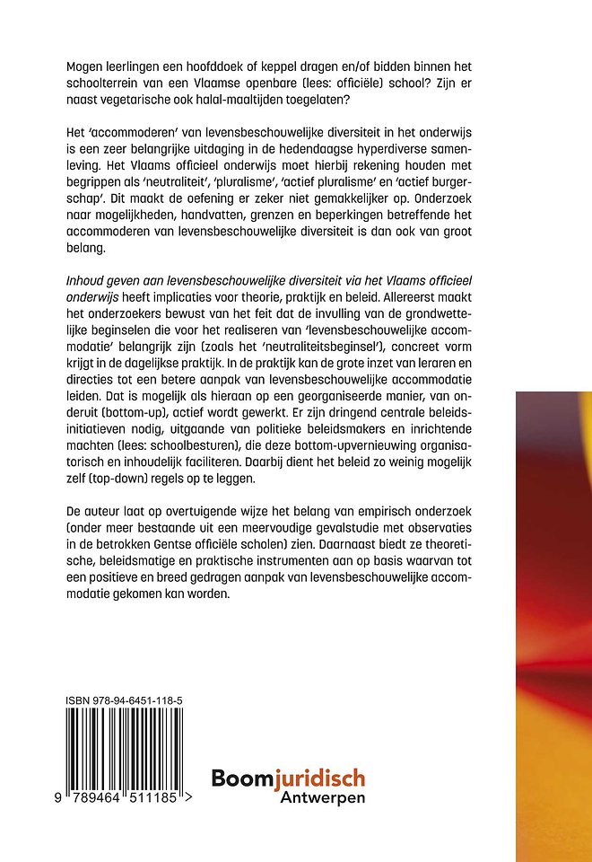 De auteur laat op overtuigende wijze het belang van empirisch onderzoek (onder meer bestaande uit een meervoudige gevalstudie met observaties in de betrokken Gentse officiële scholen) zien. Daarnaast biedt ze theoretische, beleidsmatige en praktische instrumenten aan op basis waarvan tot een positieve en breed gedragen aanpak van levensbeschouwelijke accommodatie gekomen kan worden.