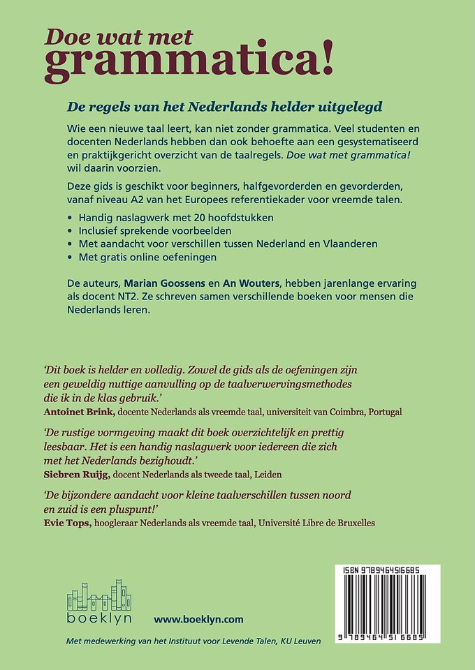 Wie een nieuwe taal leert, kan niet zonder grammatica. Veel studenten en docenten Nederlands hebben dan ook behoefte aan een gesystematiseerd en praktijkgericht overzicht van de taalregels. Doe wat met grammatica! wil daarin voorzien.