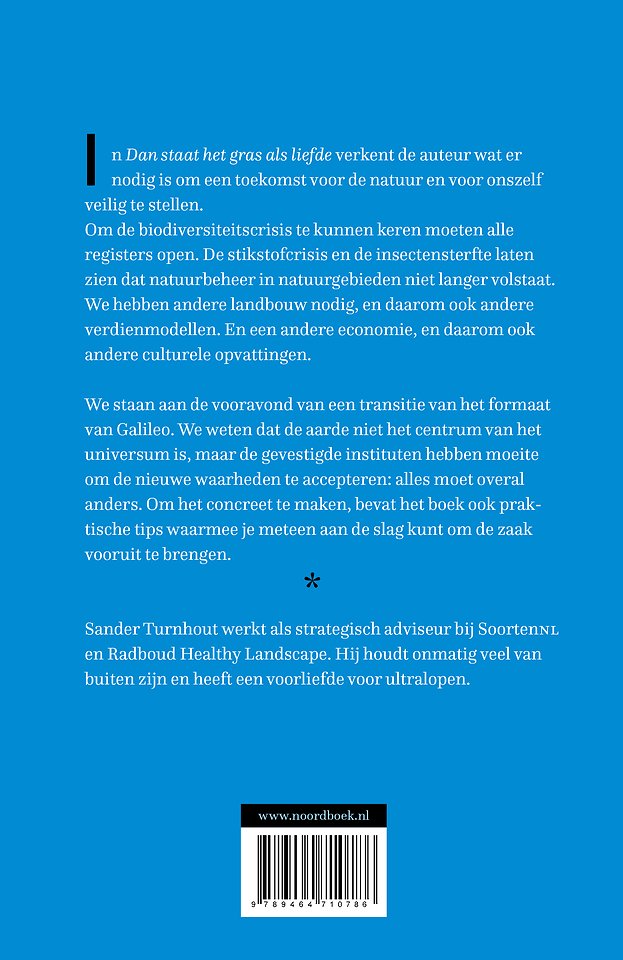 In Dan staat het gras als liefde verkent de auteur wat er nodig is om een toekomst voor de natuur en voor onszelf veilig te stellen.