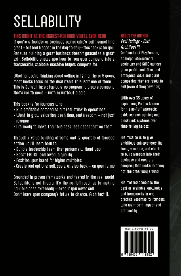 If you’re a founder or business owner who’s built something great — but feel trapped in the day-to-day — this book is for you. Because building a great business doesn’t guarantee a great exit. Sellability shows you how to turn your company into a transferable, scalable machine buyers compete for.