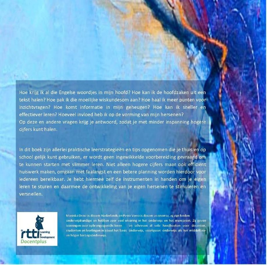 Slimmer Leren met RTTI -onderbouw VO, groep 8 BO- Hoe krijg ik al die Engelse woordjes in mijn hoofd? Hoe kan ik de hoofdzaken uit een tekst halen? Hoe pak ik die moeilijke wiskundesom aan? Hoe haal ik meer punten voor inzichtvragen? Hoe komt informatie in mijn geheugen? Hoe kan ik sneller en effectiever leren? Hoeveel invloed heb ik op de vorming van mijn hersenen?Op deze en andere vragen krijg je antwoord, zodat je met minder inspanning hogere cijfers kunt halen.In dit boek zijn allerlei praktische leerstrategieën en tips opgenomen die je thuis en op school gelijk kunt gebruiken, er wordt geen ingewikkelde voorbereiding gevraagd om te kunnen starten met slimmer leren. Niet alleen hogere cijfers maar ook efficiënt huiswerk maken, omgaan met faalangst en een betere planning worden hierdoor voor iedereen bereikbaar. Je hebt hiermee zelf de instrumenten in handen om je eigen leren te sturen en daarmee de ontwikkeling van je eigen hersenen te stimuleren en versnellen.