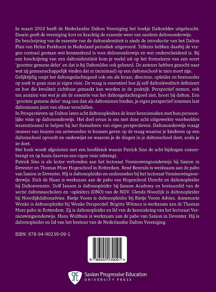 In Perspectieven op Dalton laten acht daltonopleiders de lezer kennismaken met hun persoonlijke visie op daltononderwijs. Het doel ervan is om met deze acht uitgewerkte voorbeelden leraren(teams) te helpen bij het formuleren van eigen perspectieven. Daltononderwijs vraagt immers van leraren om antwoorden te kunnen geven op de vraag waartoe je kinderen op een daltonschool opvoedt en onderwijst en waarom je de dingen in je daltonschool doet, zoals je ze doet.