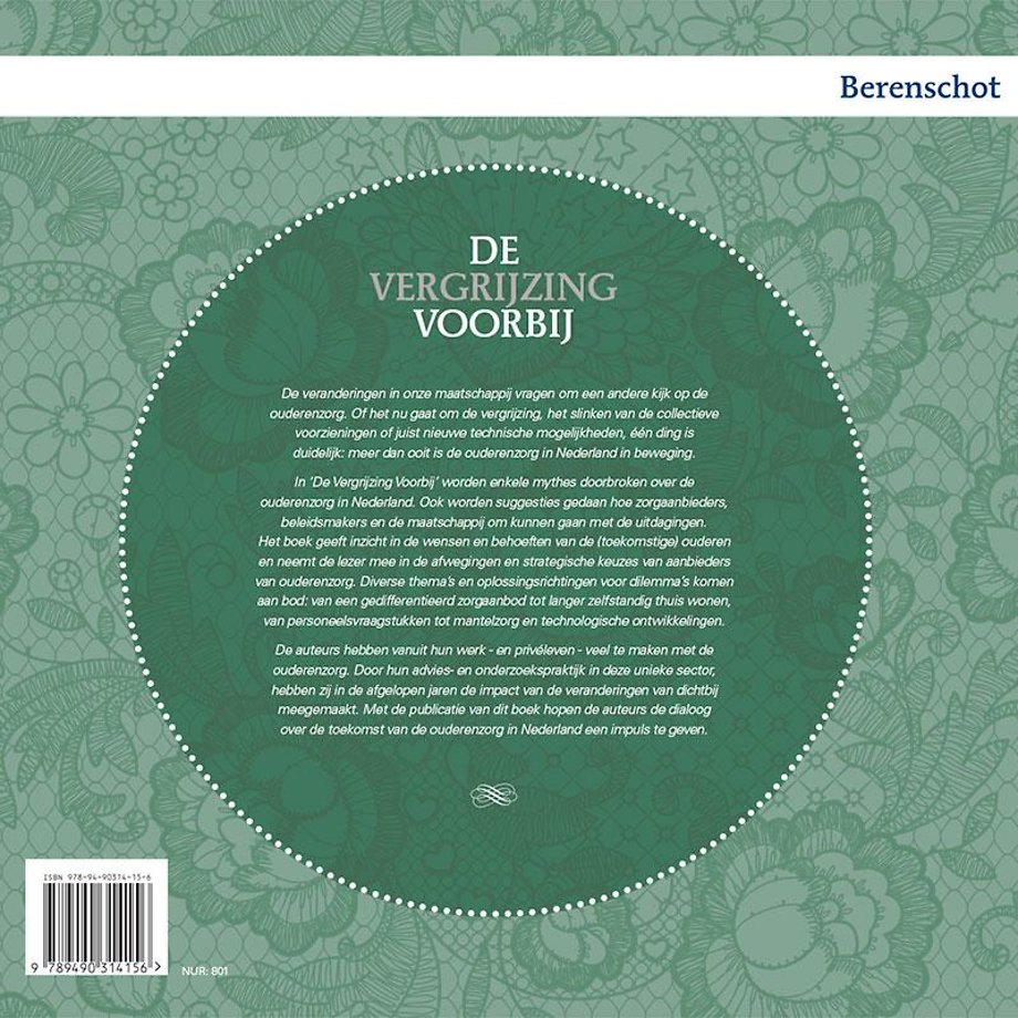 In 'De Vergrijzing Voorbij' worden enkele mythes doorbroken over de ouderenzorg in Nederland. Ook worden suggesties gedaan hoe zorgaanbieders, beleidsmakers en de maatschappij om kunnen gaan met de uitdagingen. Het boek geeft inzicht in de wensen en behoeften van de (toekomstige) ouderen en neemt de lezer mee in de afwegingen en strategische keuzes van aanbieders van ouderenzorg. Diverse thema's en oplossingsrichtingen voor dilemma's komen aan bod: van een gedifferentieerd zorgaanbod tot langer zelfstandig thuis wonen, van personeelsvraagstukken tot mantelzorg en technologische ontwikkelingen.