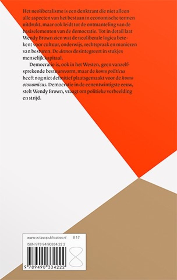 Het neoliberalisme is een denktrant die niet alleen alle aspecten van het bestaan in economische termen uitdrukt, maar ook leidt tot de ontmanteling van de basiselementen van de democratie. Tot in detail laat Wendy Brown zien wat de neoliberale logica betekent voor cultuur, onderwijs, rechtspraak en manieren van besturen. De demos desintegreert in stukjes menselijk kapitaal.