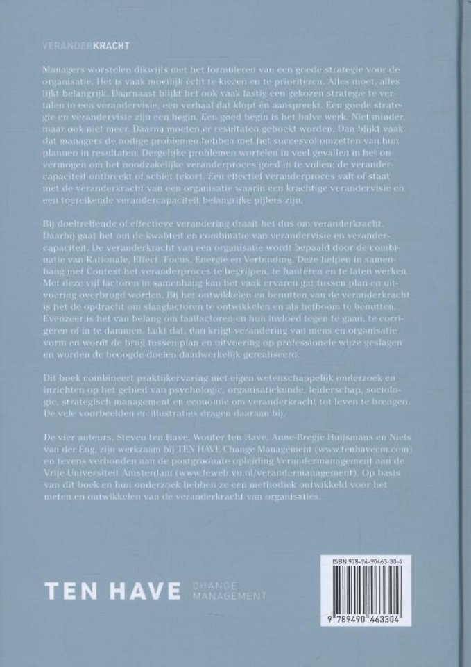 Dit boek combineert praktijkervaring met eigen wetenschappelijk onderzoek en inzichten op het gebied van psychologie, organisatiekunde, leiderschap, sociologie, strategisch management en economie om veranderkracht tot leven te brengen. De vele voorbeelden en illustraties dragen daaraan bij.