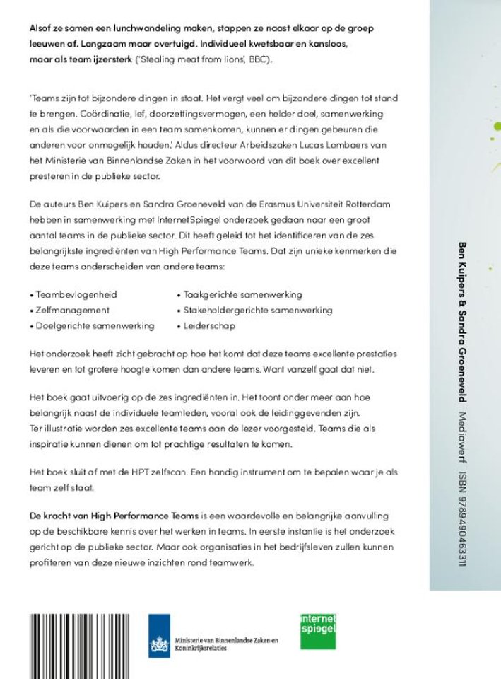 Ben Kuipers: ‘Het team maakt het verschil’ Justin van Lopik 20 augustus 2014 De prestaties van overheidsorganisaties verschillen onderling vaak nauwelijks. De scores per team variëren echter aanzienlijk. Deze opvallende conclusie uit het overheidsprogramma InternetSpiegel was aanleiding voor een onderzoek naar het succes van teams. Daar lijkt ‘winst’ te halen. Het resultaat is gevangen in een boek: De kracht van High Performance Teams. Lees het volledige artikel