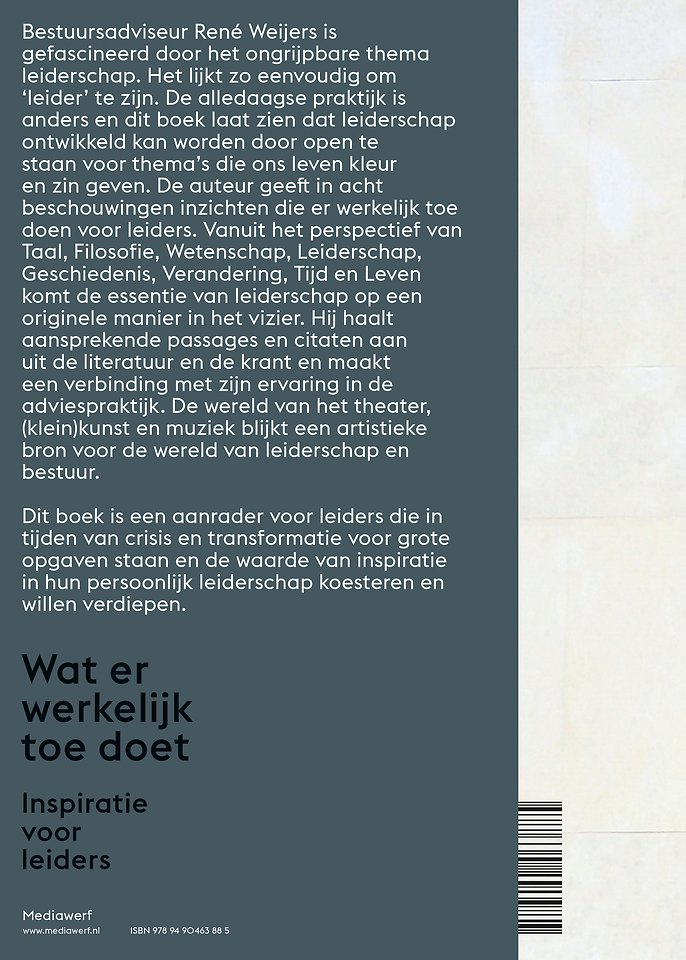 Meer over René WeijersBestuursadviseur René Weijers is gefascineerd door het ongrijpbare thema leiderschap. Het lijkt zo eenvoudig om ‘leider’ te zijn. De alledaagse praktijk is anders en dit boek laat zien dat leiderschap ontwikkeld kan worden door open te staan voor thema’s die ons leven kleur en zin geven.