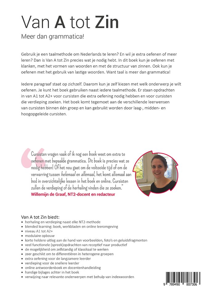 Gebruik je een taalmethode om Nederlands te leren? En wil je extra oefenen of meer leren? Dan is Van A tot Zin precies wat je nodig hebt. In dit boek kun je oefenen met klanken, met het vormen van woorden en met de structuur van zinnen. Ook kun je oefenen met het gebruik van lastige woorden. Want taal is meer dan grammatica!