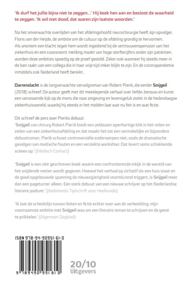 Darrenslacht is de langverwachte vervolgroman van Robert Pierik, die eerder Snijgeil (2018) schreef. De auteur geeft met dit meeslepende verhaal over liefde, berouw en kunst een verrassende kijk op de mens die naar zingeving en levensgeluk zoekt in de hedendaagse ziekenhuiswereld, waarbij hij steeds in het midden laat wat nu feit is en wat fictie.