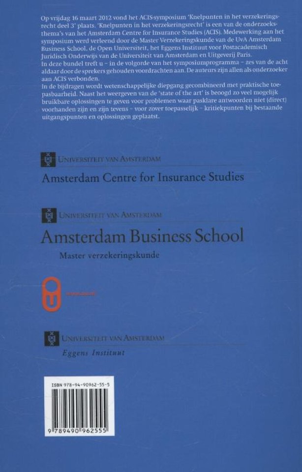 Op vrijdag 16 maart 2012 vond het ACIS-symposium `Knelpunten in het verzekeringsrecht deel 3' plaats. `Knelpunten in het verzekeringsrecht' is een van de onderzoeksthema¿s van het Amsterdam Centre for Insurance Studies (ACIS). Medewerking aan het symposium werd verleend door de Master Verzekeringskunde van de UvA Amsterdam Business School, de Open Universiteit, het Eggens Instituut voor Postacademisch Juridisch Onderwijs van de Universiteit van Amsterdam en Uitgeverij Paris.In deze bundel treft u in de volgorde van het symposiumprogramma zes van de acht aldaar door de sprekers gehouden voordrachten aan. De auteurs zijn allen als onderzoeker aan ACIS verbonden.In de bijdragen wordt wetenschappelijke diepgang gecombineerd met praktische toepasbaarheid. Naast het weergeven van de 'state of the art' is beoogd zo veel mogelijk bruikbare oplossingen te geven voor problemen waar pasklare antwoorden niet (direct) voorhanden zijn en zijn tevens voor zover toepasselijk kritiekpunten bij bestaande uitgangspunten en oplossingen geplaatst.