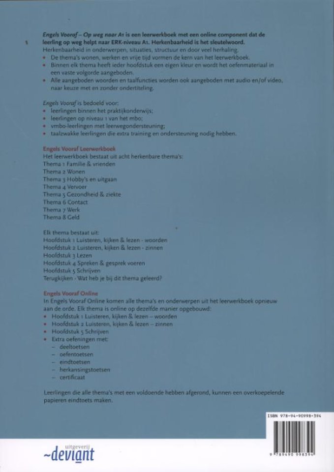 engels taalbeheersing praktijkonderwijs onderwijs a1-niveau leerwegondersteunend onderwijs taal speciaal onderwijs taalverwerving leerwerkboek taalonderwijs thematisch leren langzame leerders dyslexie functioneel leren audiovisueel leren spreekvaardigheid woordenschat luistervaardigheid leesvaardigheid communicatie schrijfvaardigheid herhaling dagelijkse communicatie structuur digitaal leren taalzwakke leerlingen taalvaardigheid toetsing visueel leren