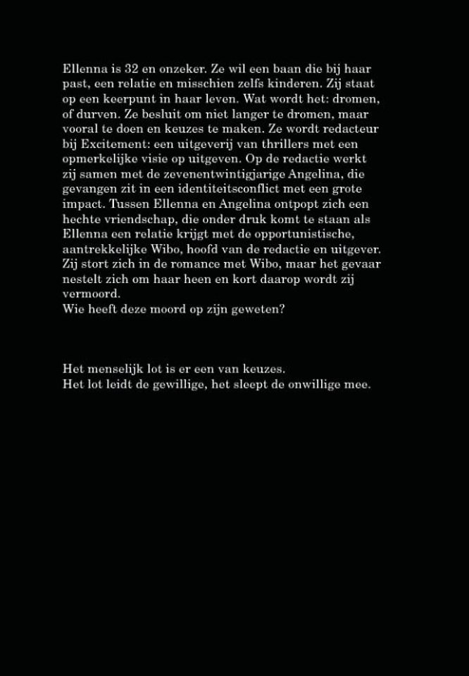 Ellenna is 32 en onzeker. Ze wil een baan die bij haar past, een relatie en misschien zelfs kinderen. Zij staat op een keerpunt in haar leven. Wat wordt het: dromen, of durven. Ze besluit om niet langer te dromen, maar vooral te doen en keuzes te maken. Ze wordt redacteur bij Excitement: een uitgeverij van thrillers met een opmerkelijke visie op uitgeven. Op de redactie werkt zij samen met de zevenentwintigjarige Angelina, die gevangen zit in een identiteitsconflict met een grote impact. Tussen Ellenna en Angelina ontpopt zich een hechte vriendschap, die onder druk komt te staan als Ellenna een relatie krijgt met de opportunistische, aantrekkelijke Wibo, hoofd van de redactie en uitgever. Zij stort zich in de romance met Wibo, maar het gevaar nestelt zich om haar heen en kort daarop wordt zij vermoord.