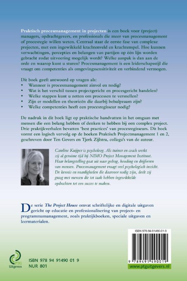 Praktisch procesmanagement in projecten is een boek voor (project) managers, opdrachtgevers, en professionals die meer van procesmanagement of procesregie willen weten. Centraal staat de eerste fase van complexe projecten, met een ingewikkeld krachtenveld en krachtenspel. Hoe kunnen verwachtingen, percepties en belangen van partijen op één lijn worden gebracht zodat uitvoering mogelijk wordt? Welke aanpak is dan aan de orde en waarop kunt u sturen? Procesmanagement is een leiderschapsstijl die vraagt om competenties als omgevingssensitiviteit en verbindend vermogen.