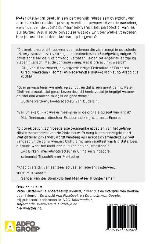 Peter Olsthoorn geeft in een persoonlijk relaas een overzicht van alle aspecten rondom privacy. Vanuit het perspectief van de marketeer, vanuit dat van de overheid, maar ook vanuit het perspectief van u als burger. Wat is uw privacy u waard? En voor welke voordelen bent u bereid een deel daarvan op te geven?
