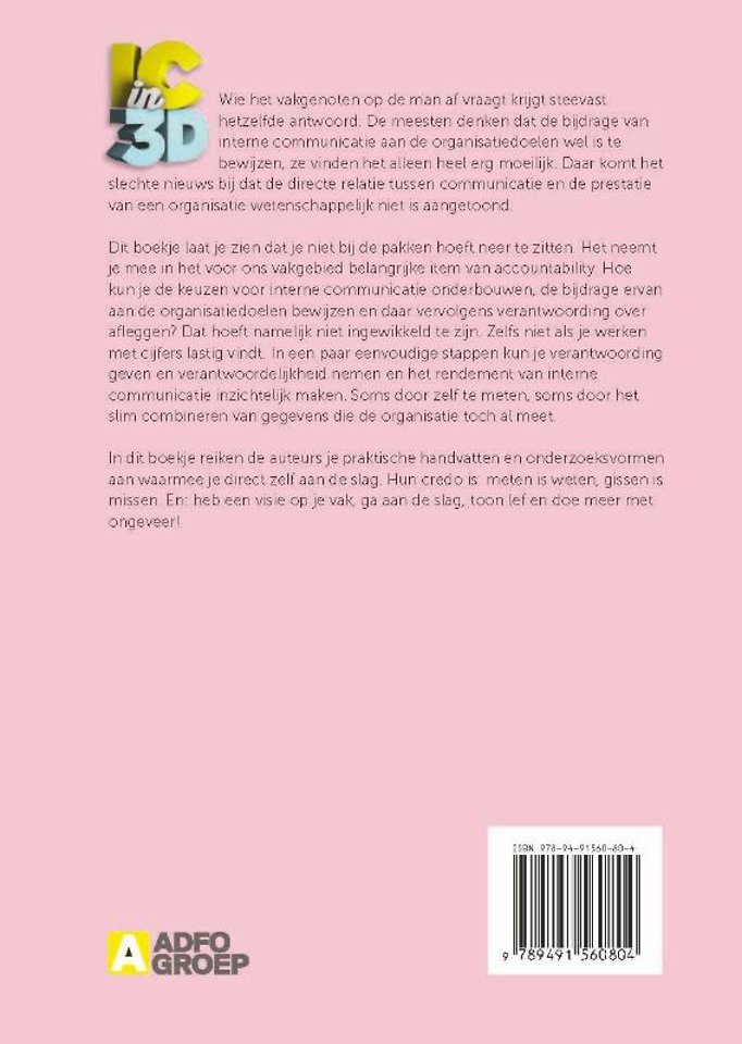 Dit boekje laat je zien dat je niet bij de pakken hoeft neer te zitten. Het neemt je mee in het voor ons vakgebied belangrijke item van accountability. Hoe kun je de keuzen voor interne communicatie onderbouwen, de bijdrage ervan aan de organisatiedoelen bewijzen en daar vervolgens verantwoording over afleggen? Dat hoeft namelijk niet ingewikkeld te zijn. Zelfs niet als je werken met cijfers lastig vindt.