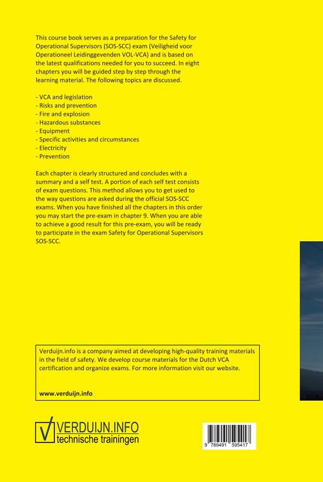 This course book serves as a preparation for the Safety for Operational Supervisors (SOS-SCC) exam (Veiligheid voor Operationeel Leidinggevenden VOL-VCA) and is based on the latest qualifications needed for you to succeed. In eight chapters you will be guided step by step through the learning material. The following topics are discussed.