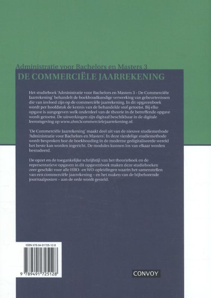 Het studieboek 'Administratie voor Bachelors en Masters 3 - De Commerciële Jaarrekening' behandelt de boekhoudkundige verwerking van gebeurtenissen die van invloed zijn op de commerciële jaarrekening. In dit opgavenboek wordt per hoofdstuk de kennis van de behandelde stof getoetst. Bij elke opgave is aangegeven welk onderdeel van de theorie in de betreffende opgave wordt getoetst. De uitwerkingen zijn digitaal beschikbaar in de digitale leeromgeving op www.abm3commercielejaarrekening.nl.
