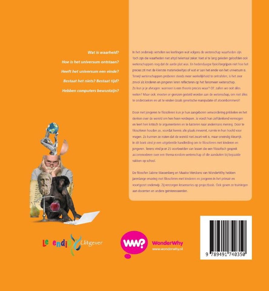 Tevens vind je er 25 voorbeelden van lessen om een filosofisch gesprek te voeren over een thema rondom wetenschap aansluitend bij vakken op school. Een uitdaging voor kinderen en jongeren van 10 tot 18 jaar.