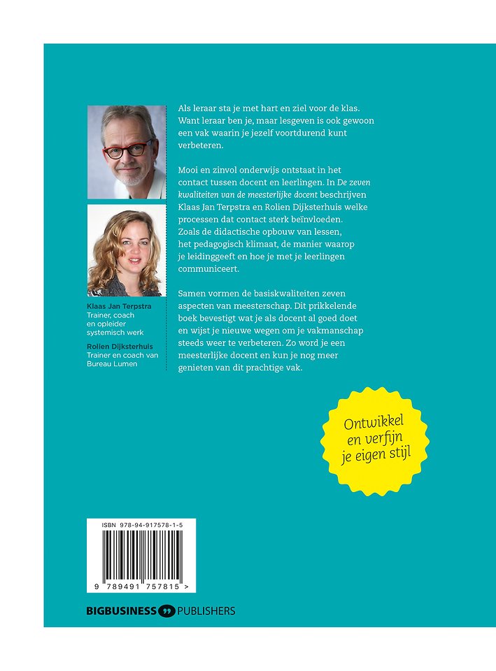 Mooi en zinvol onderwijs ontstaat in het contact tussen docent en leerlingen. In De zeven kwaliteiten van de meesterlijke docent beschrijven Klaas Jan Terpstra en Rolien Dijksterhuis welke processen dat contact sterk beïnvloeden. Zoals de didactische opbouw van lessen, het pedagogisch klimaat, de manier waarop je leidinggeeft en hoe je met je leerlingen communiceert.