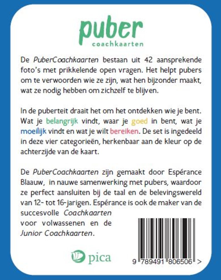 De PuberCoachkaarten bestaan uit 42 aansprekende foto’s met prikkelende open vragen. Het helpt pubers om te verwoorden wie ze zijn, wat hen bijzonder maakt, wat ze nodig hebben om zichzelf te blijven.