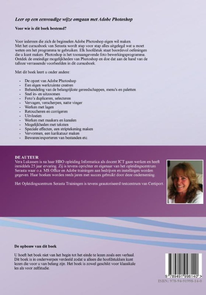 Met het cursusboek van Serasta wordt stap voor stap alles uitgelegd wat u moet weten om het programma te gebruiken. Elk hoofdstuk staat boordevol oefeningen die u kunt maken. Photoshop is het toonaangevende foto bewerkingsprogramma. Ontdek de oneindige mogelijkheden van Photoshop en doe dat aan de hand van de talloze verrassende voorbeelden in dit cursusboek.