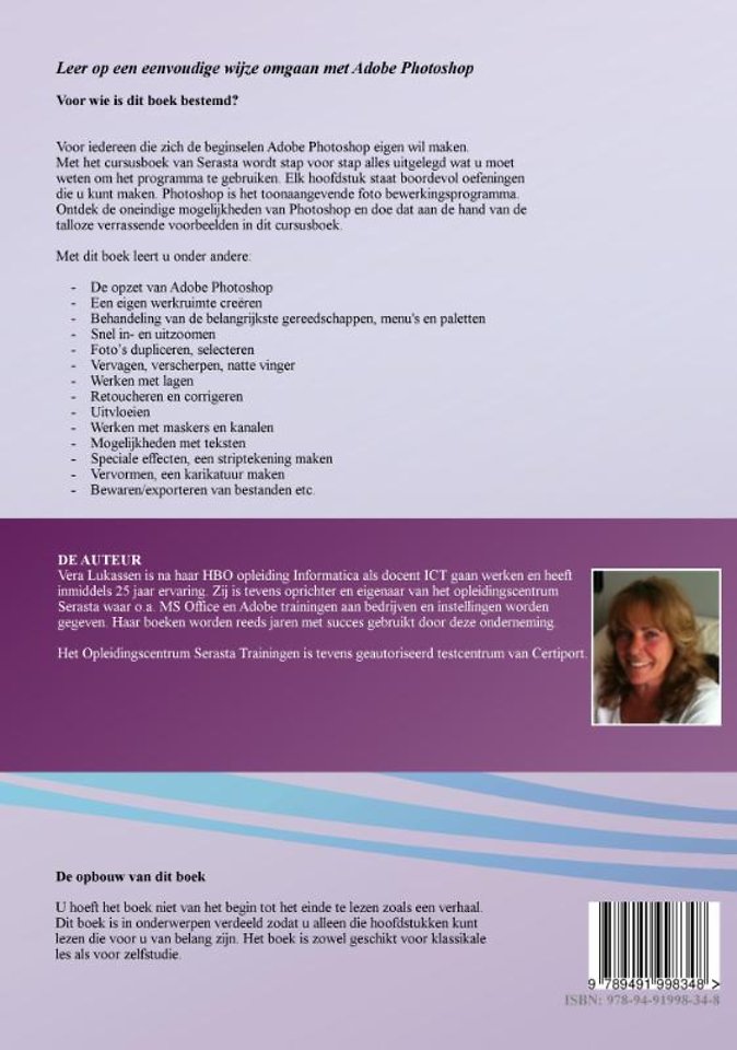Met het cursusboek van Serasta wordt stap voor stap alles uitgelegd wat u moet weten om het programma te gebruiken. Elk hoofdstuk staat boordevol oefeningen die u kunt maken. Photoshop is het toonaangevende foto bewerkingsprogramma. Ontdek de oneindige mogelijkheden van Photoshop en doe dat aan de hand van de talloze verrassende voorbeelden in dit cursusboek.