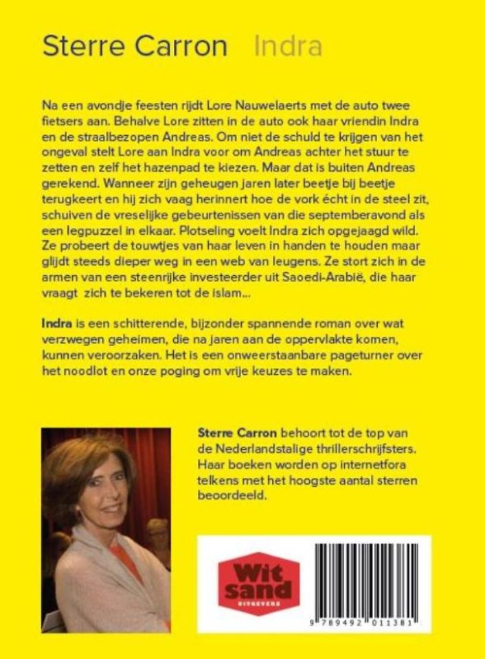 Meer over Sterre CarronNa een avondje feesten rijdt Lore Nauwelaerts met de auto twee fietsers aan. Behalve Lore zitten in de auto ook haar vriendin Indra en de straalbezopen Andreas. Om niet de schuld te krijgen van het ongeval stelt Lore aan Indra voor om Andreas achter het stuur te zetten en zelf het hazenpad te kiezen. Maar dat is buiten Andreas gerekend. Wanneer zijn geheugen jaren later beetje bij beetje terugkeert en hij zich vaag herinnert hoe de vork écht in de steel zit, schuiven de vreselijke gebeurtenissen van die septemberavond als een legpuzzel in elkaar. Plotseling voelt Indra zich opgejaagd wild.