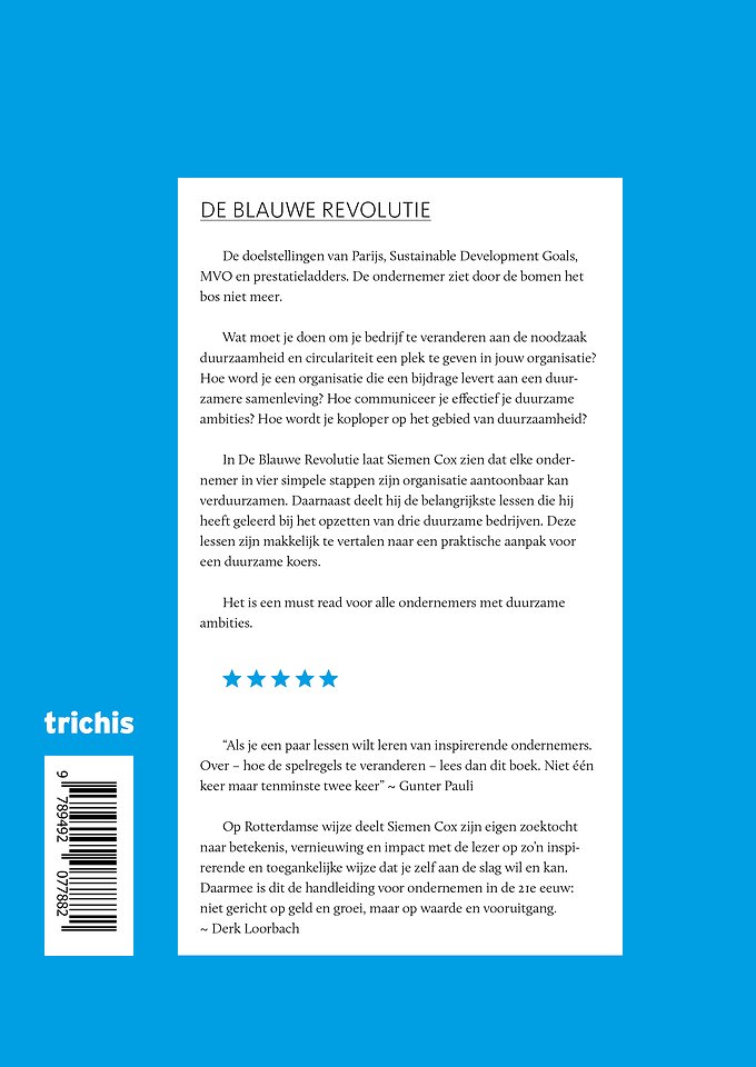 In De Blauwe Revolutie laat Siemen Cox zien dat elke ondernemer in vier simpele stappen zijn organisatie aantoonbaar kan verduurzamen. Daarnaast deelt hij de belangrijkste lessen die hij heeft geleerd bij het opzetten van drie duurzame bedrijven. Deze lessen zijn makkelijk te vertalen naar een praktische aanpak voor een duurzame koers.