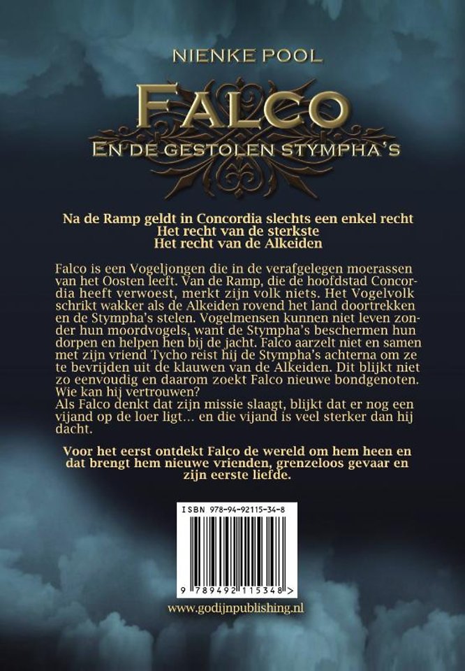 Falco en de gestolen Stympha's is een YA fantasy verhaal dat losjes is gebaseerd op de mythe van Herakles en zijn gevecht tegen de Stymphalische Moordvogels uit de Moerassen van het Oosten. Falco en de gestolen Stympha's is een verhaal over vriendschap, moed en het ontdekken van nieuwe werelden.