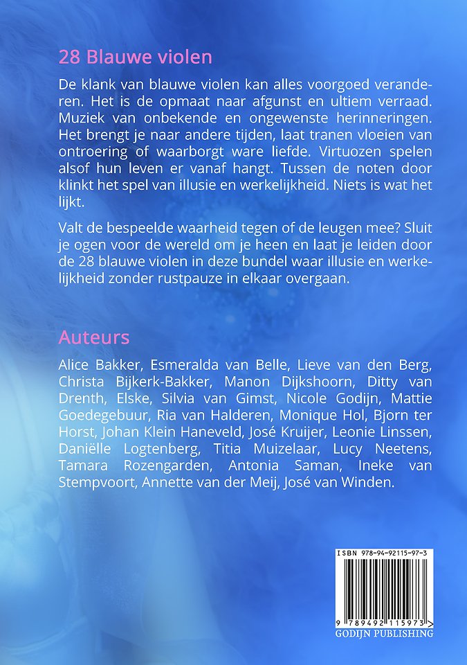 Valt de bespeelde waarheid tegen of de leugen mee? Sluit je ogen voor de wereld om je heen en laat je leiden door de 28 blauwe violen in deze bundel waar illusie en werkelijkheid zonder rustpauze in elkaar overgaan.