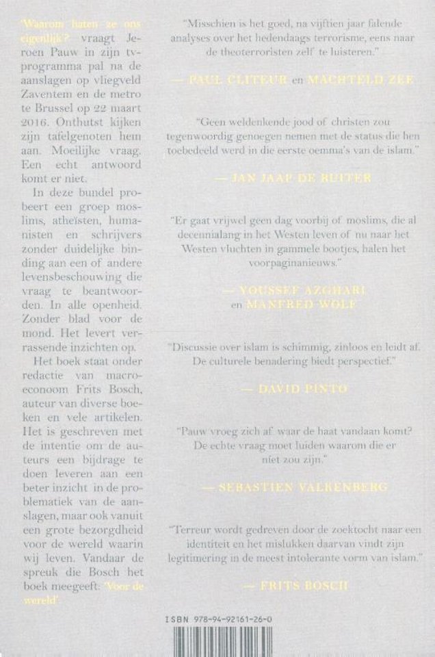 'Waarom haten ze ons eigenlijk'? vraagt Jeroen Pauw in zijn tv-programma pal na de aanslagen op vliegveld Zaventem en de metro te Brussel op 22 maart 2016. Onthutst kijken zijn tafelgenoten hem aan. Moeilijke vraag. Een echt antwoord komt er niet.