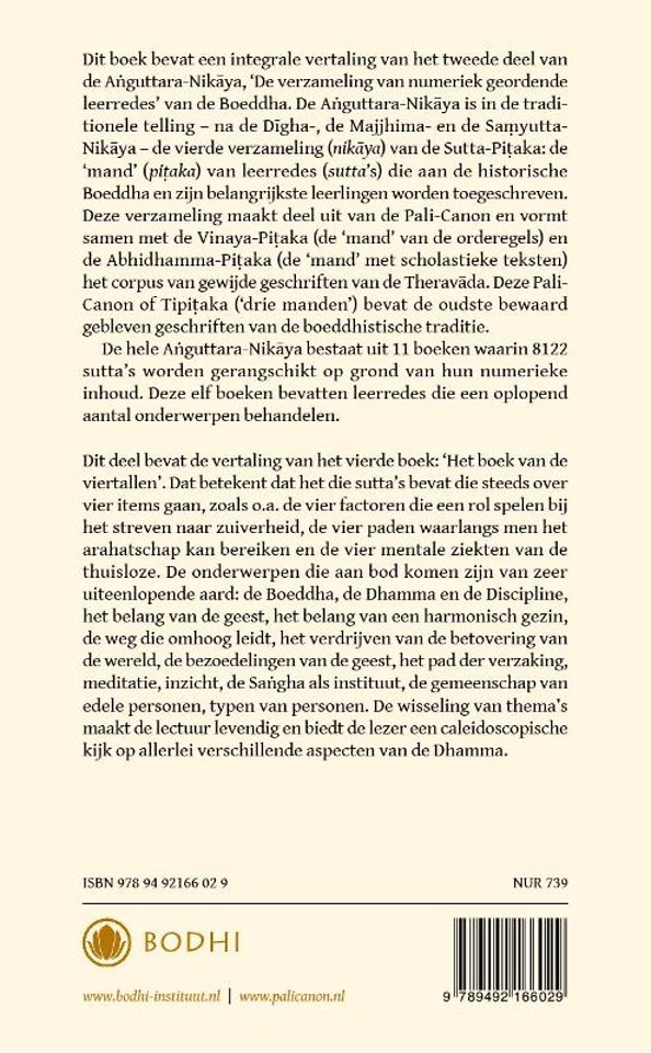 Dit deel bevat de vertaling van 'Het boek van de viertallen'. Dat betekent dat het die sutta's bevat die steeds over vier items gaan, zoals o.a. de vier factoren die een rol spelen bij het streven naar zuiverheid, de vier paden waarlangs men het arahatschap kan bereiken en de vier mentale ziekten van de thuisloze. De onderwerpen die aan bod komen zijn van zeer uiteenlopende aard: de Boeddha, de Dhamma en de Discipline, het belang van de geest, het belang van een harmonisch gezin, de weg die omhoog leidt, het verdrijven van de betovering van de wereld, de bezoedelingen van de geest, het pad der verzaking, meditatie, inzicht, de Sangha als instituut, de gemeenschap van edele personen, typen van personen. De wisseling van thema's maakt de lectuur levendig en biedt de lezer een caleidoscopische kijk op allerlei verschillende aspecten van de Dhamma.