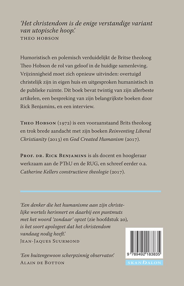 Humoristisch en polemisch verduidelijkt de Britse theoloog Theo Hobson de rol van geloof in de huidige samenleving. Vrijzinnigheid moet zich opnieuw uitvinden: overtuigd christelijk zijn in eigen huis en uitgesproken humanistisch in de publieke ruimte. Dit boek bevat twintig van zijn allerbeste artikelen, een bespreking van zijn belangrijkste boeken door Rick Benjamins, en een interview.