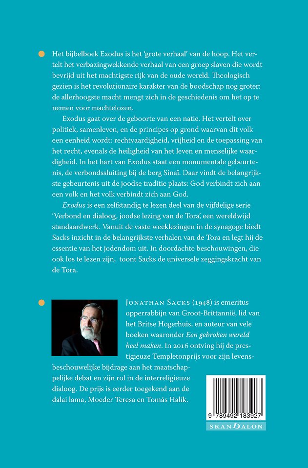 Exodus is een zelfstandig te lezen deel van de vijfdelige serie ‘Verbond en dialoog, joodse lezing van de Tora', een wereldwijd standaardwerk. Vanuit de vaste weeklezingen in de synagoge biedt Sacks inzicht in de belangrijkste verhalen van de Tora en legt hij de essentie van het jodendom uit. In doordachte beschouwingen, die ook los te lezen zijn, toont Sacks de universele zeggingskracht van de Tora.