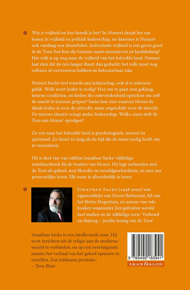 Sacks brengt de overgangsperiode van de eerste naar de tweede generatie bevrijde Israëlieten heel dichtbij. Hij schetst het grote verschil van de generatie met een slavenmentaliteit naar de generatie van vrije mensen die zelf mogen kiezen. Numeri laat zien hoe Mozes er zelf bijna aan ten onder gaat, zijn leiderschap staat op het spel. Met als gevolg dat hij de transitie zelf niet mee mag maken. Ik heb een geweldige vakantie gehad. Sterk aanbevolen!’