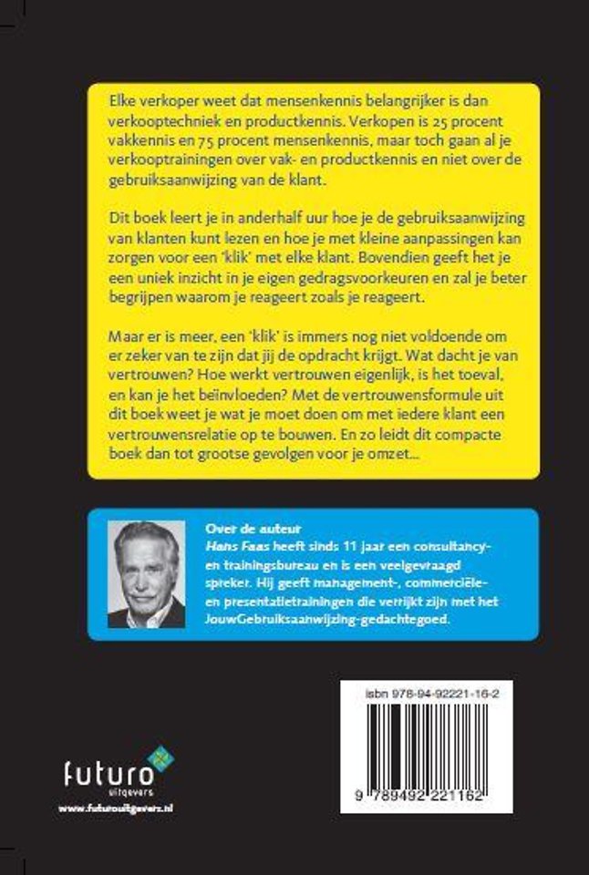 Verkopen is 25% vakkennis en 75% mensenkennis. Reden genoeg dus om te leren hoe je de gebruiksaanwijzing van je klant kunt lezen, want zo zorg je met wat kleine aanpassingen voor een ‘klik' en vertrouwen. En meer omzet.