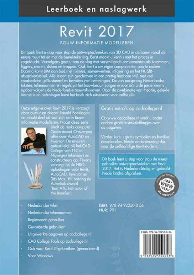 Op de site van de uitgever vindt u onder andere gratis instructiefilmpjes over de opgaven. Verder kunt u gratis symbolen en families downloaden. Ideale ondersteuning dus voor de zelfstandige Revit-student. Deze uitgave over Revit 2017 is verzorgt door auteur en docent Ronald Boeklagen en maakt deel uit van zijn serie Bouw Informatie Modelleren. Naast deze serie biedt de reeks 'Computer Ondersteund Ontwerpen' alles over AutoCAD en Inventor.