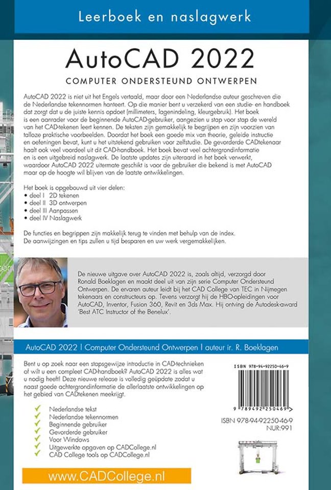 De nieuwe uitgave voor AutoCAD 2022 is, zoals altijd, geschreven door Ir. Ronald Boeklagen en maakt deel uit van zijn serie Computer Ondersteund Ontwerpen. De ervaren auteur leidt bij het CADCollege van TEC in Nijmegen tekenaars en constructeurs op. Tevens verzorgt hij de HBO-opleidingen voor AutoCAD, Inventor, 3ds Max en Revit. Hij ontving de Autodesk award ‘Best ATC Instructor of the Benelux’.