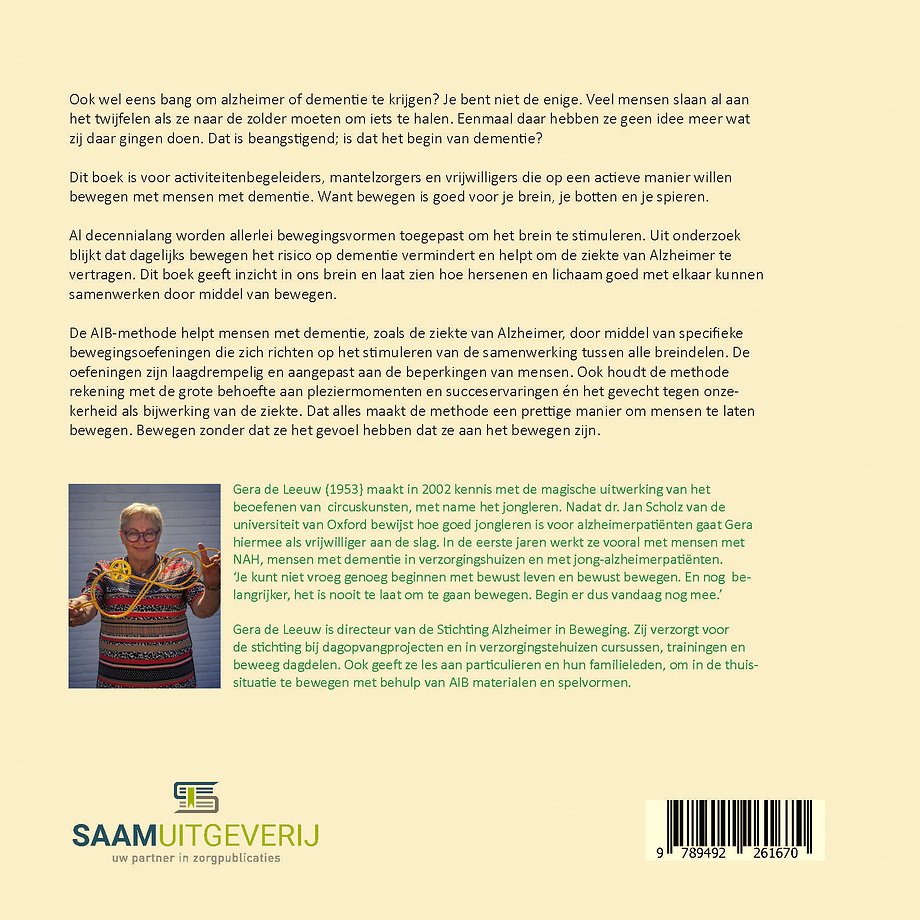 In dit boek Alzheimer in Beweging wordt de methode uitgelegd aan de hand van de theorie en de praktijk. Een overzichtelijk boek met kleurrijke tekeningen, voorbeeldoefeningen en bijzondere ervaringen uit de praktijk.