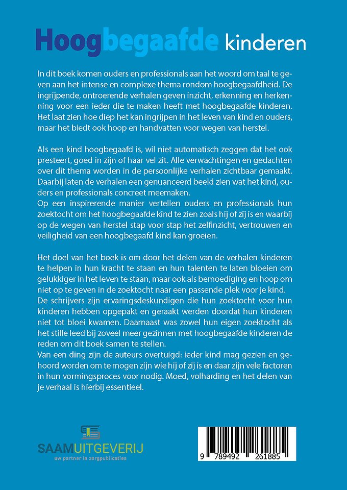 In dit boek komen ouders en professionals aan het woord om taal te geven aan het intense en complexe thema rondom hoogbegaafdheid. De ingrijpende, ontroerende verhalen geven inzicht, erkenning en herkenning voor een ieder die te maken heeft met hoogbegaafde kinderen. Het laat zien hoe diep het kan ingrijpen in het leven van kind en ouders, maar het biedt ook hoop en handvatten voor wegen van herstel.